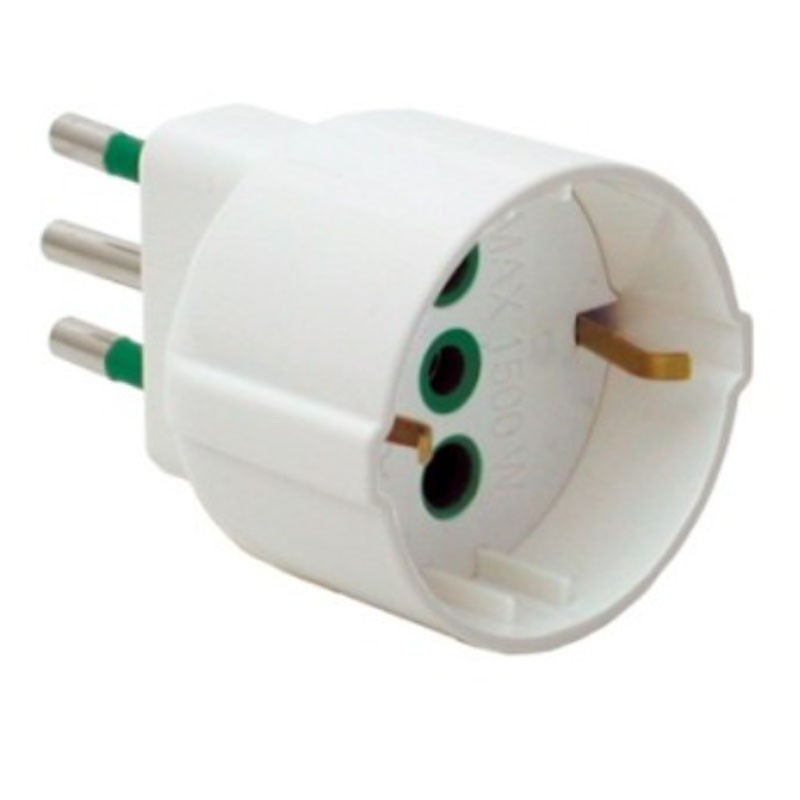 Adapter Fanton, consisting of plug, Italian plug 2P+T 16A socket Italian/German 2P+T 16A white in color.