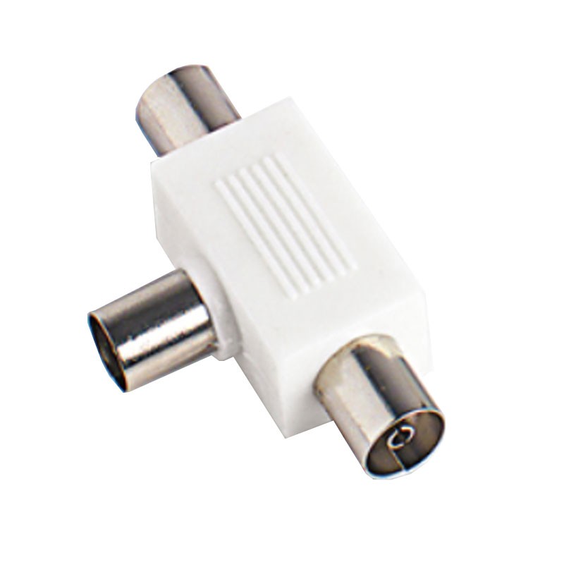 Shielded inductive triple TV adapter from 9.5 mm diameter plug to 2 9.5 mm diameter sockets.