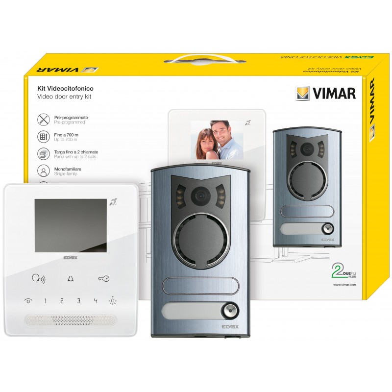 Kit video intercom handsfree color Two-Wire Plus contains: 1 plate 1300 series flush-mounted or wall-mounted anodised aluminium 13K1 with 1 extra button R131, 1 electronic unit, audio/video 13F2, 1 video intercom hands-free Tab Free from the wall with colour display 3,5 7539 white, 1 power supply 6922.1