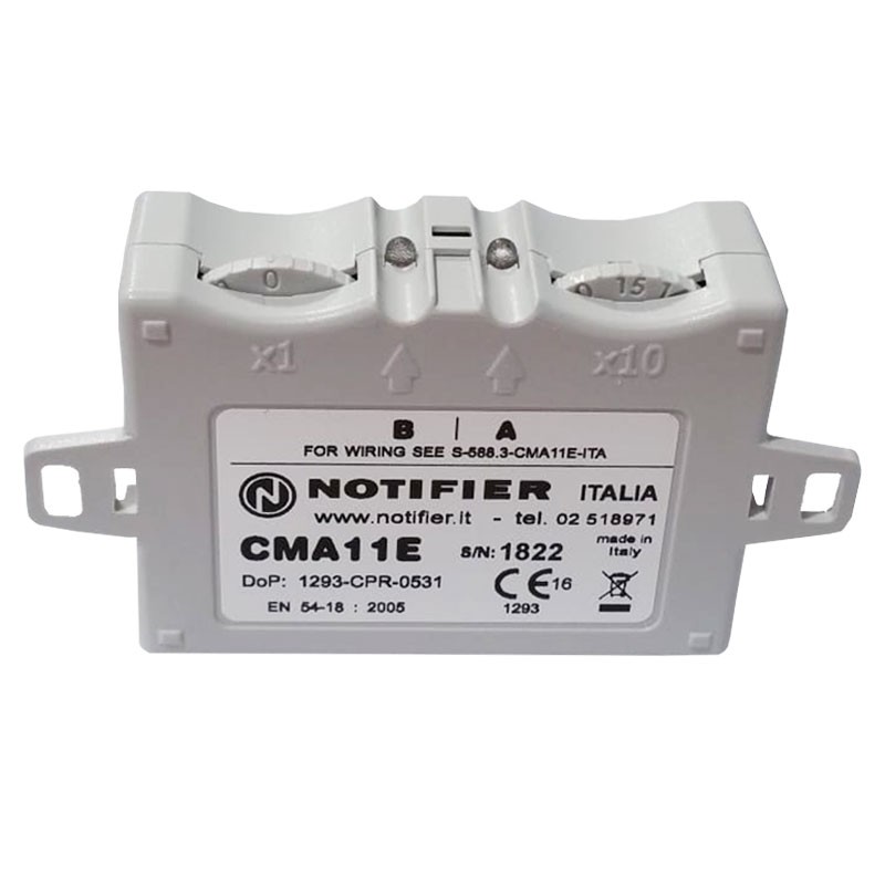 The CMA11E module is equipped with one input and one output. Compatible with all NOTIFIER addressed control panels with both CLIP (1-99) and Advanced (1-159) protocols, the module is microprocessor controlled. The status of the module can be easily checked via the 2 LEDs on the device. CMA11E provides an output circuit for polarized optical/acoustic signalers or a relay with potential-free contacts, selectable via dip-switches. Characterized by its very small size, the module is designed to be housed in type B503 flush-mount boxes.