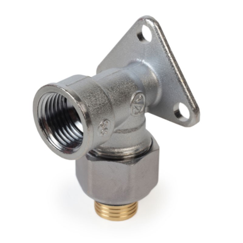 Giacomini female threaded elbow fitting, with wall bracket, for plastic or multilayer pipes. Dimensions 1/2" x (20 x 2).