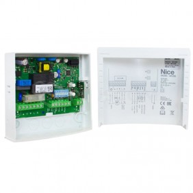 Came control panel for two-leaf swing gates, 230V power supply, with graphic display card for programming and signalling and self-diagnosis of safety devices, with limit switch management and slowdown speed adjustment.