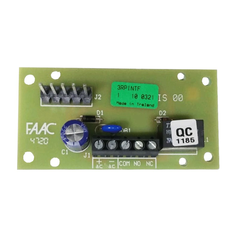 Relay interface for Faac radio receiver. Allows the use of RP receivers on systems not equipped with a quick-fit connector with a wired connection.