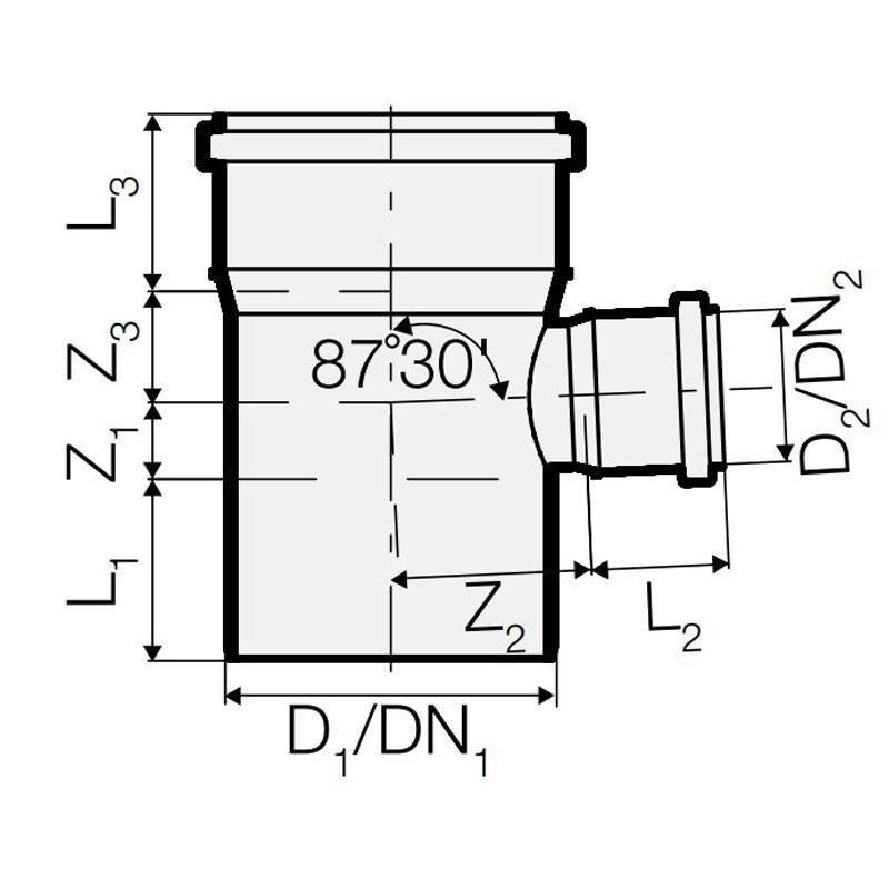 Reduced 87-degree 30' Plug-in Waste Water Connection for PP Polypropylene Valsir Triplus plug-in soundproof drainpipes with the following characteristics: