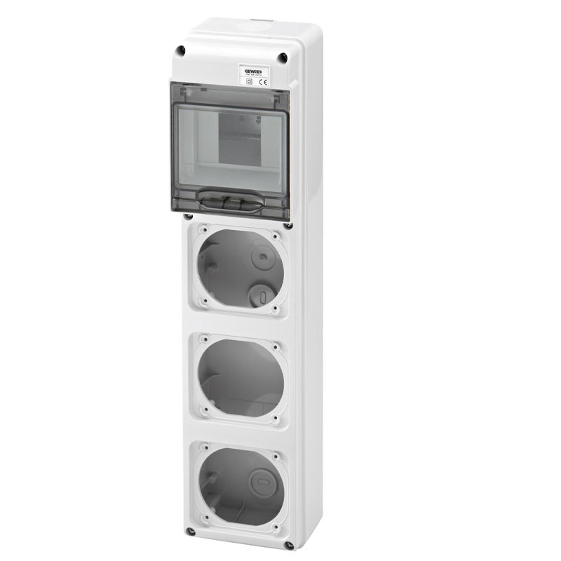 Gewiss switchboard, 5 modules with 3 flanges for industrial sockets.