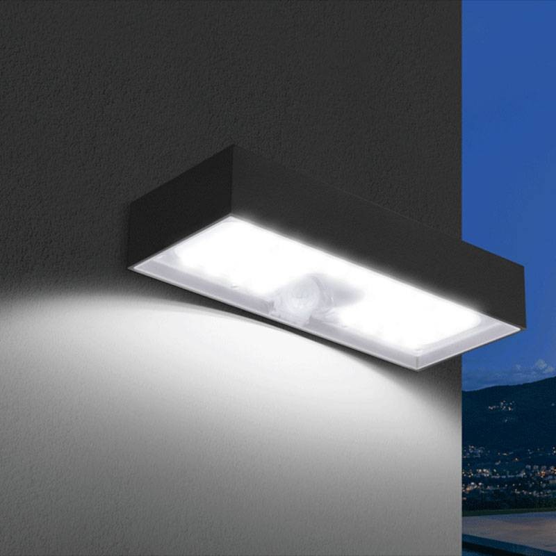 Solar wall light with photovoltaic panel, twilight sensor and PIR motion sensor. Shape suitable for practical and discreet installations.