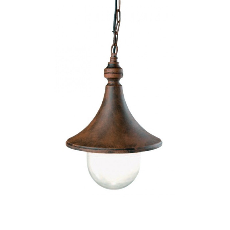 Suspension lamp for garden sovil LAMPARA Copper color (Rust), in die-cast aluminium. Diffusers in transparent thermoplastic. Power supply cable H05RN-F 3G1. Max height of the lamp: 150mm. Power Supply 230 V ~ 50 Hz. Degree of protection IP43. Lamp E27 (not included) Max 60W, size: 34x25cm.