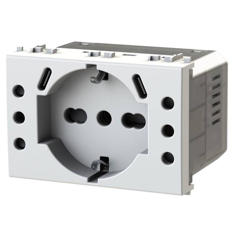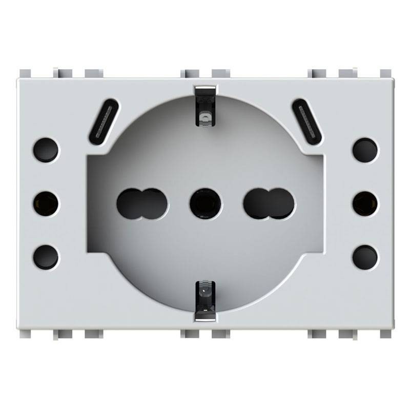 USB Socket 4Box P503 compatible with Vimar Plana White series with 5 outlets and a single power terminal, consisting of 2 USB 3A Type C outlets, 1 schuko, 2 10A outlets and 1 10/16 A outlet.