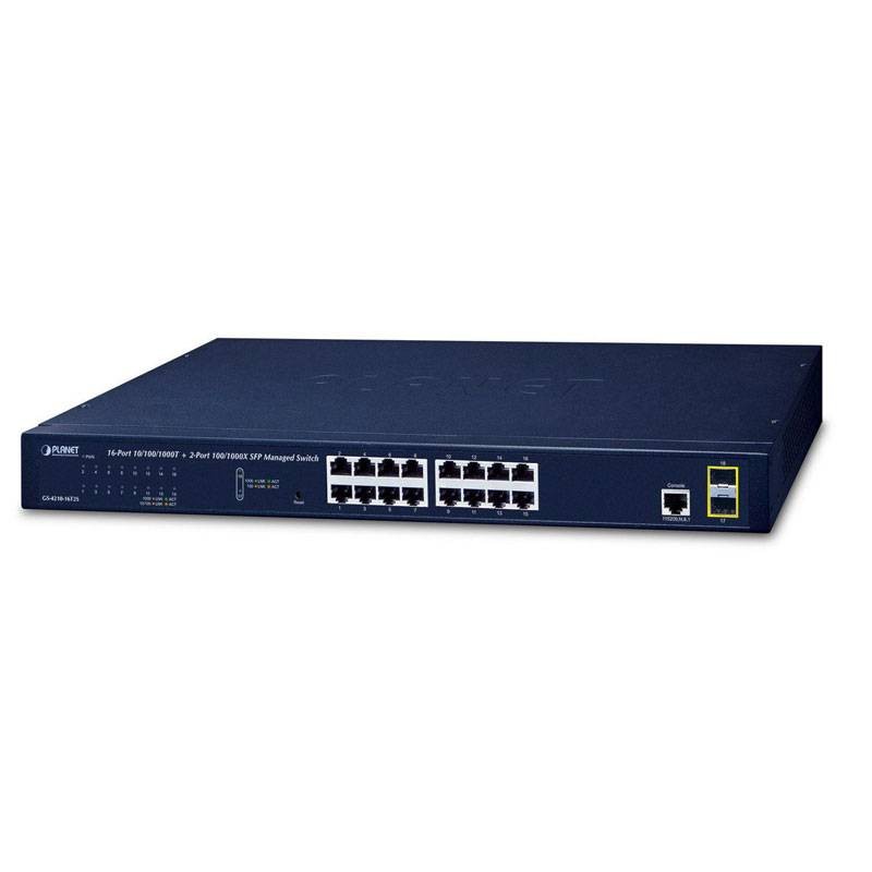 The GS-4210-16T2Sfeatures 16 10/100/1000BASE-T Gigabit Ethernet ports and 2 additional 100/1000BASE-X SFP interfaces with internal power system. It offers an affordable, secure and reliable rack-mountable Gigabit network switch solution for SMBs deploying networks or requiring enhanced data security and network traffic management.
