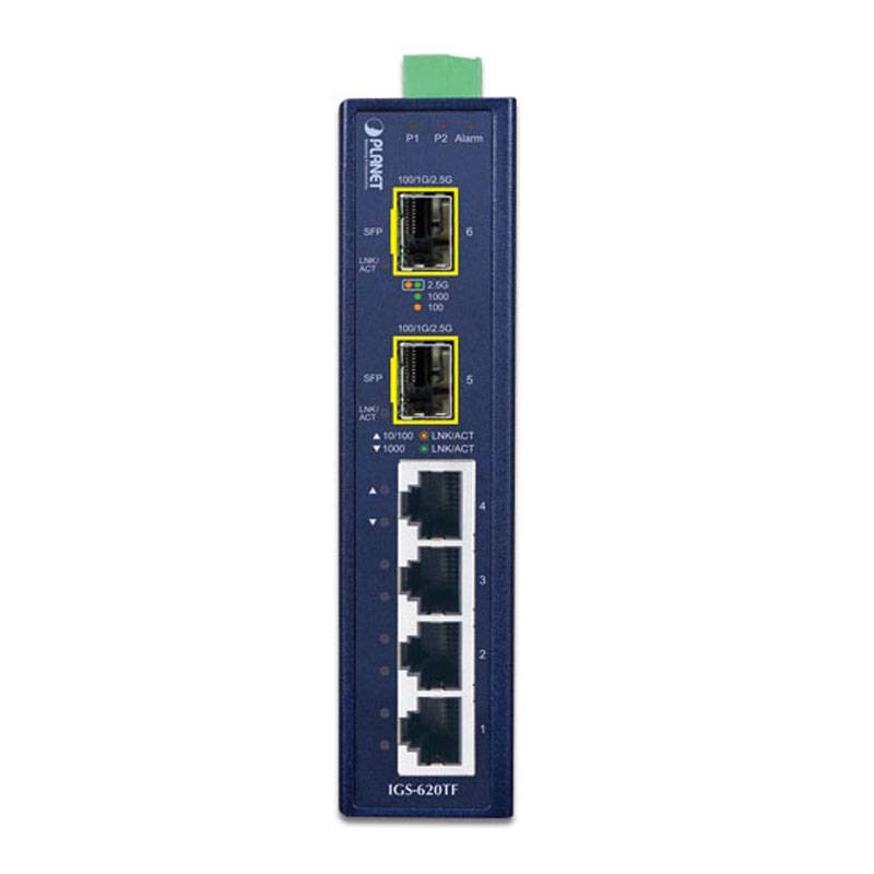 Pay in installments with KlarnaPLANET IGS-620TF is a full-featured 6-port industrial Gigabit Ethernet switch offering non-blocking wire-speed performance and great flexibility for Gigabit Ethernet extension in harsh industrial environments. It provides 4 copper 10/100/1000BASE-T RJ45 ports and 2 additional fiber optic 100/1000/2500BASE-X SFP interfaces provided in a rugged IP30 enclosure with redundant power system. The IGS-620TF is suitable for applications such as deploying surveillance systems and protecting wireless control and service in harsh weather environments with a wide temperature range of -40 to +75°C.