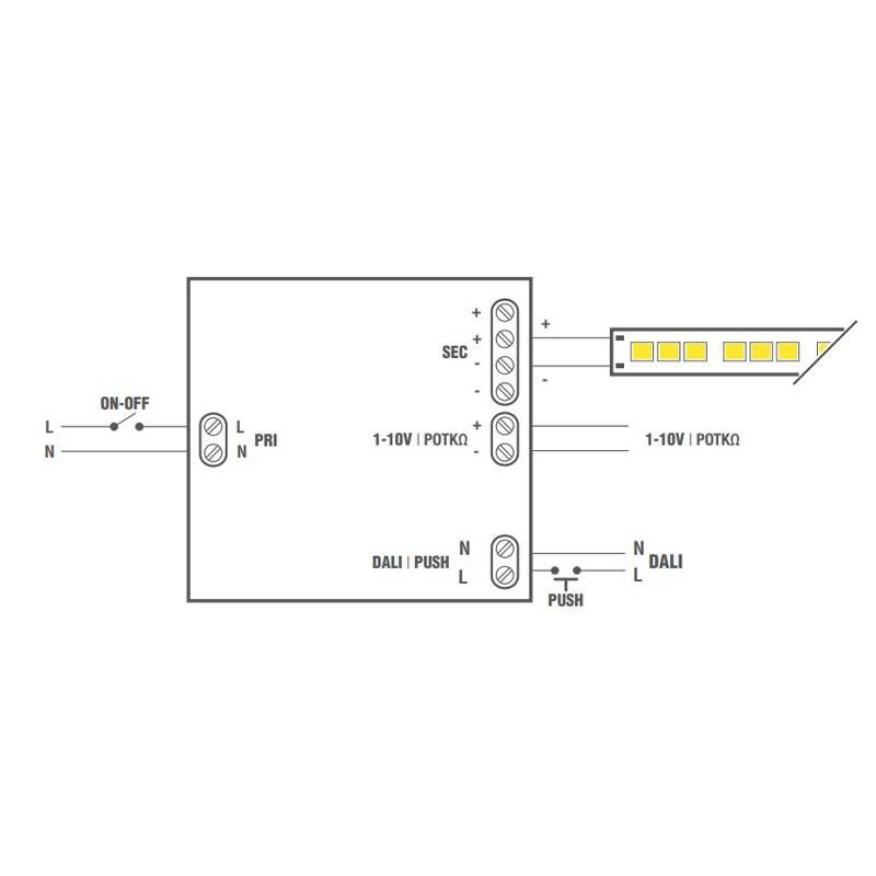 - Brightness adjustment via: push button (PUSH 230Vac), push button (PUSH 24Vdc), DALI signal, 0-10V signal, 1-10V signal, 47Kohm potentiometer
