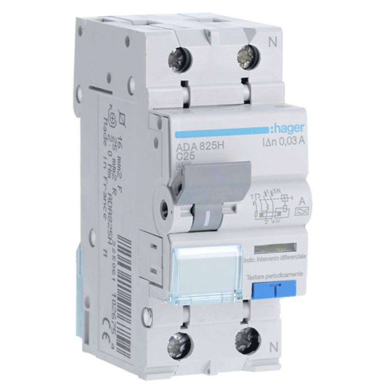 Hager differential magnetothermal switch, 2 modules, DIN connection (universal for any switchboard on the market), 1P+N, 25 amperes, breaking capacity 4.5kA, rated voltage 240 Vac, rated differential current 30mA, type A, trip curve C.