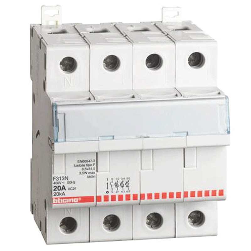 Fuse holder Bticino 3P+E 20A 4 fuse modules 8,5x31,5mm F313N