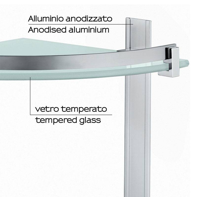 Gedy Cloud shower caddy, corner shape, with 2 shelves, tempered glass and anodized aluminum material, size 26x26x30cm.