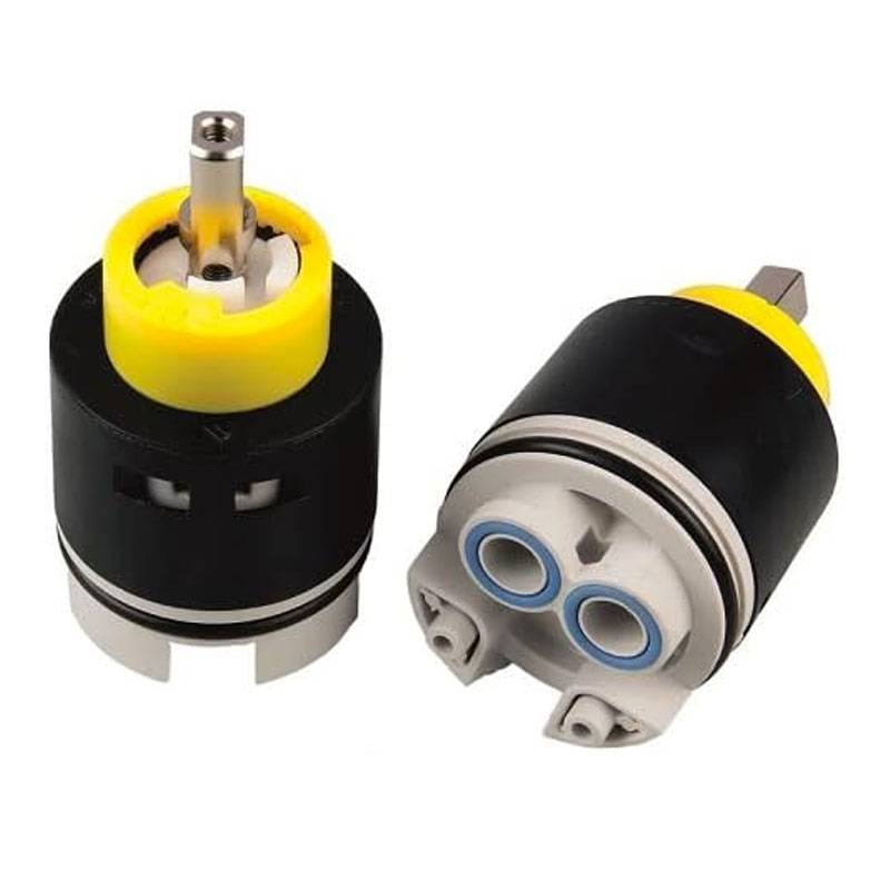 The mixer faucet cartridge has an outer shell made of solid and durable plastic material, while the inner structure is composed of two ceramic discs that allow water to flow out and mix without presenting annoying leaks during the course of use.