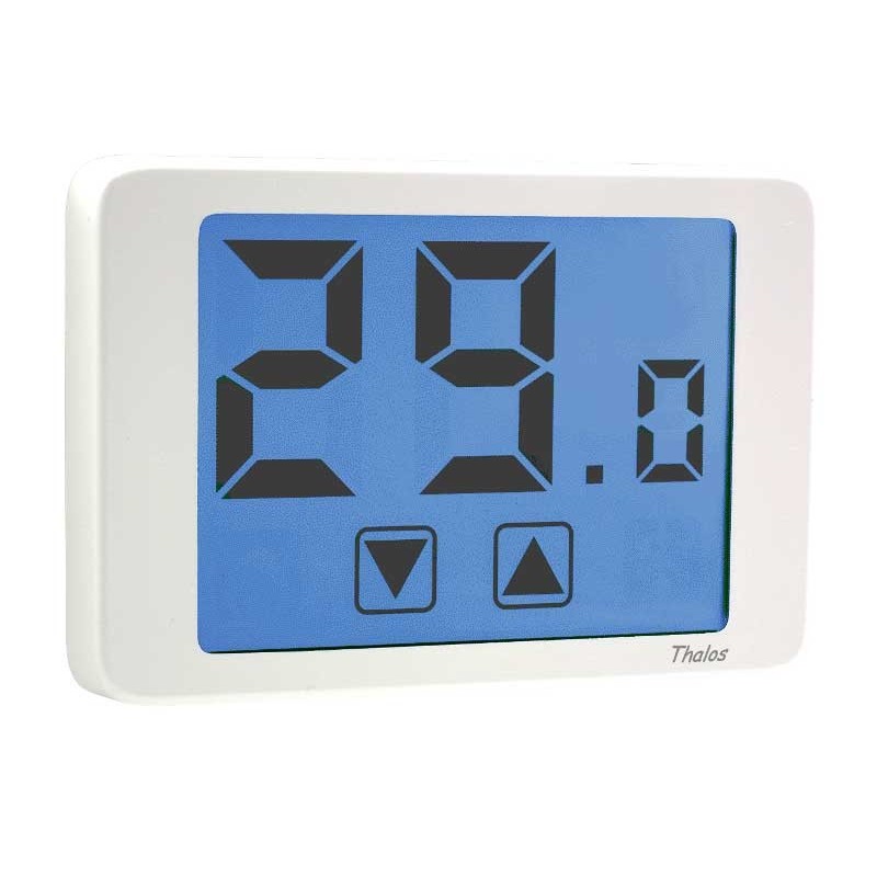 Thermostat touch screen from wall and battery power. The touch screen keyboard is represented by 2 icons, colour display with blue backlight (activated at the touch of a button), provides elegance and sobriety.