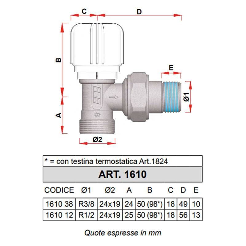 - Chrome-plated thermostatizable angle valve for radiators arranged for mounting thermostatic or electrothermal devices, with connection for copper, plastic, and multilayer pipe, pre-gasketed tang, seal between tang and valve body in HPF, interchangeable stainless steel pin with double o-ring seal, and ABS handwheel. Max operating temperature 95°C . Max operating pressure 10 bar.