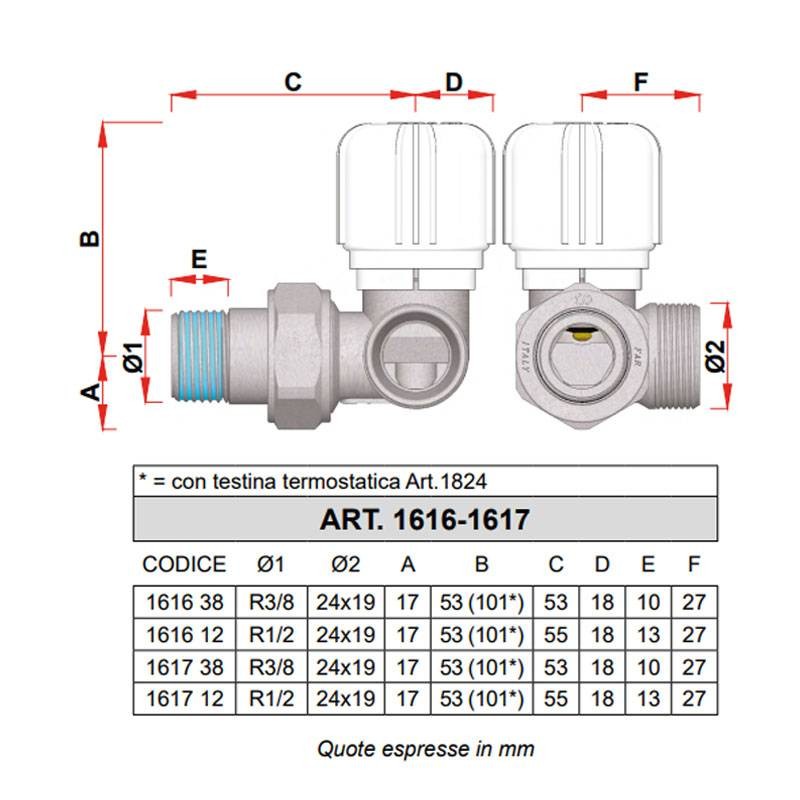 - Chrome-plated, right-angle, thermostatable valve for radiators arranged for mounting thermostatic or electrothermal devices, with connection for copper, plastic and multilayer pipe, pre-gasketed tang, seal between tang and valve body in HPF, interchangeable stainless steel pin with double o-ring seal and ABS handwheel. Max operating temperature 95°C . Max operating pressure 10 bar.