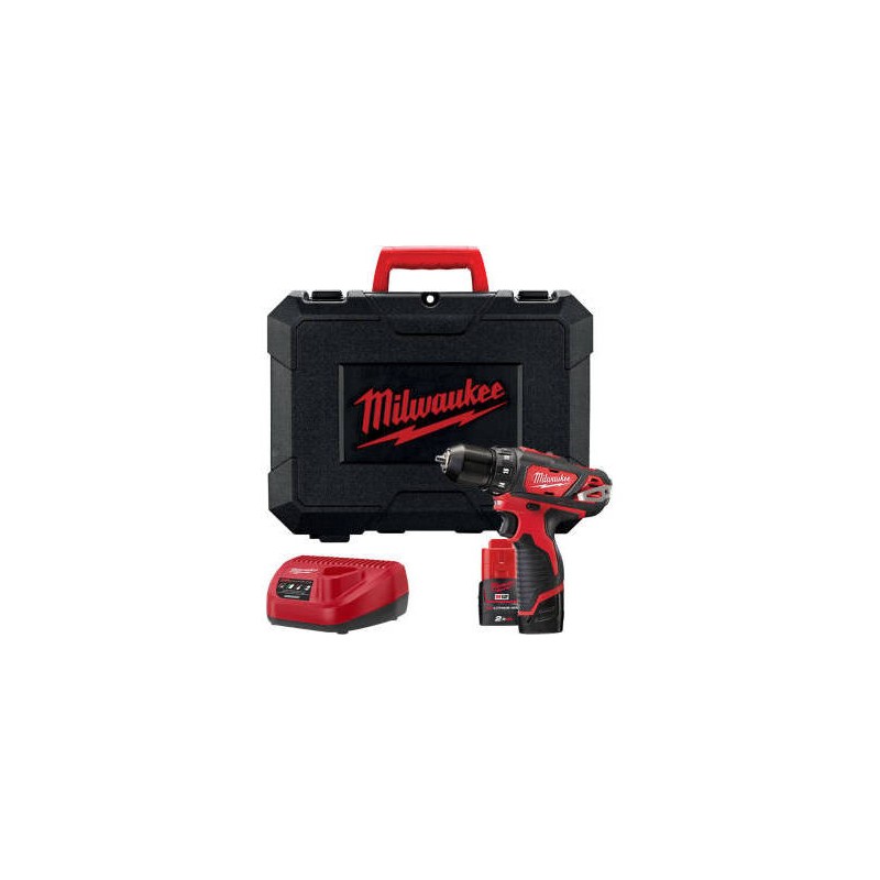 Drill driver Milwaukee compact percussion, friction from 2 to 18, 2 batteries, 12V each and a charger included,two-speed capacity of the spindle is 1.5 to 10 mm LED low-battery indicator and LED space, blinds,all supplied with hard carrying case to transport M12 BDD-202C.12V 4933441915