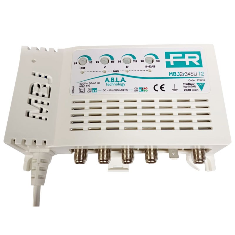 - Con 4 entradas (III+DAB, IV, V, UHF) autoalimentadas en interiores con 20dB de ganancia y nivel de salida de hasta 115dBμV en la banda UHF