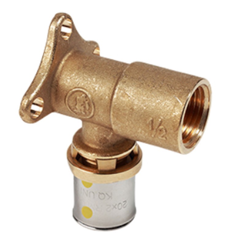 Racor Giacomini curvado a 90°, con rosca hembra, multipolar, con rosca hembra y soporte para instalación en pared, para tubos multicapa serie Multigas. Dimensiones 1/2" x (20 x 2).