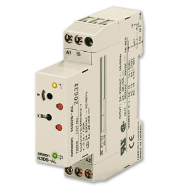 Temporizador multifunción Omron 24 v a 230 VAC (50/60 Hz), Salida, control, SPDT, Rango de ajuste de tiempo (De 0.1 s a 120 h, la activación de Retraso, comienza a parpadear, a iniciar EN el parpadeo, delay ON / OFF de la señal, y un retardo a la activación de la señal, intervalo, one-shot.