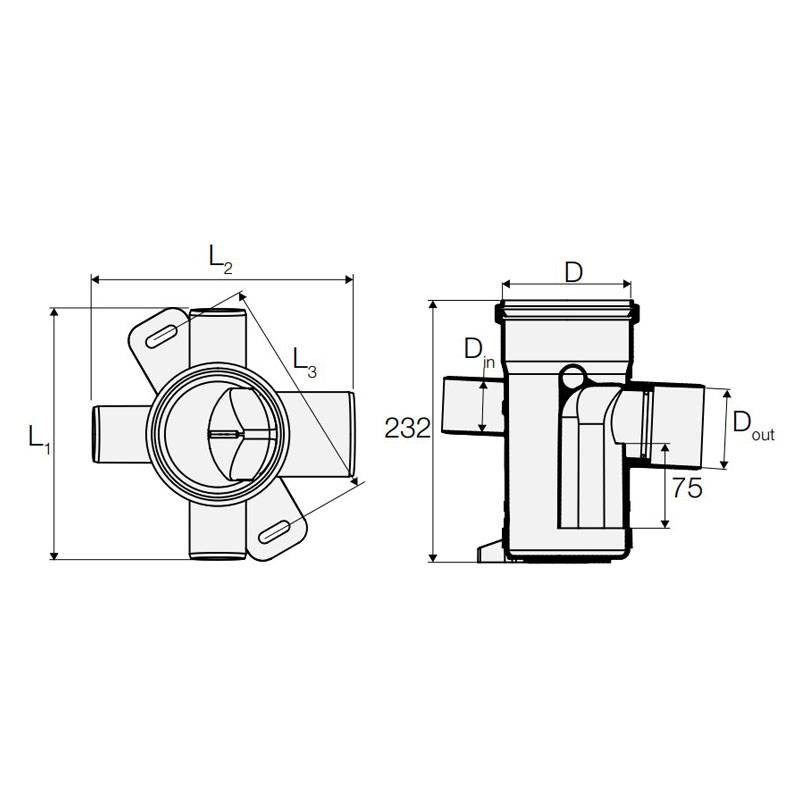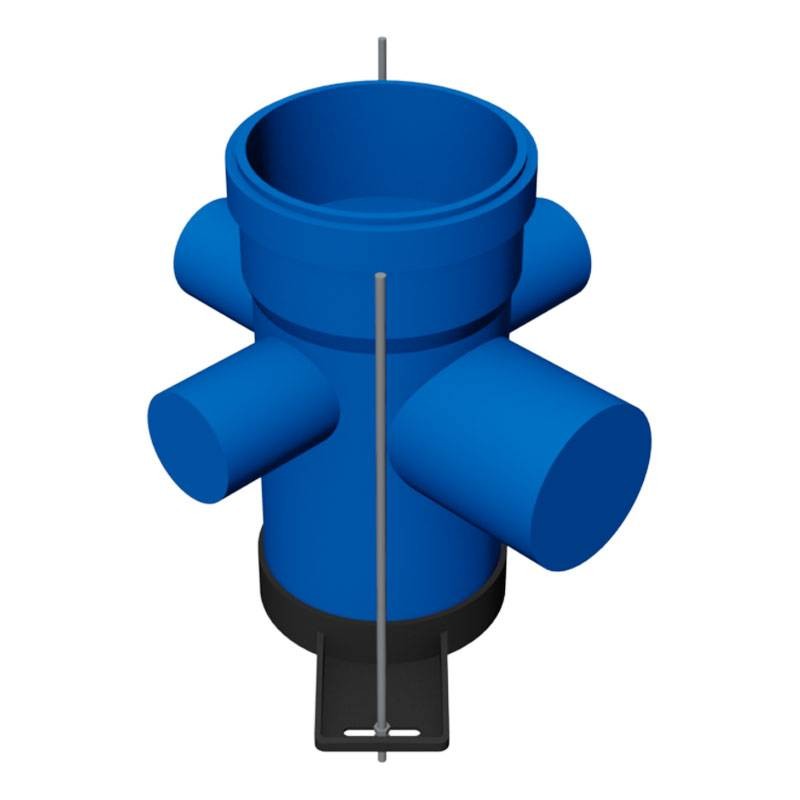 Sumidero con junta hidráulica compuesto por una entrada superior de 110 mm de diámetro con toma y junta de estanqueidad, 3 entradas laterales (cerradas y preparadas para perforación) y 1 salida lateral. Junta hidráulica de 75 mm mediante inserto desmontable con espacio de extracción de 100 mm. Se suministra completo con soporte inferior ajustable para montaje en techo.