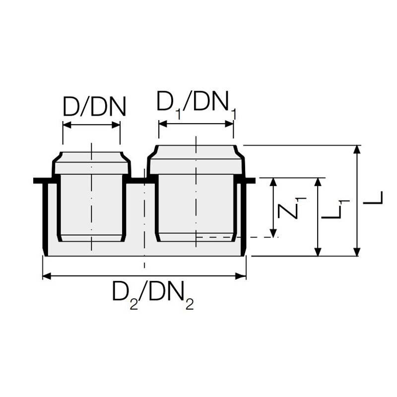 Reducción racor doble para tubos de descarga de PP Polipropileno enchufable Valsir PP3 HTDR con las siguientes características: