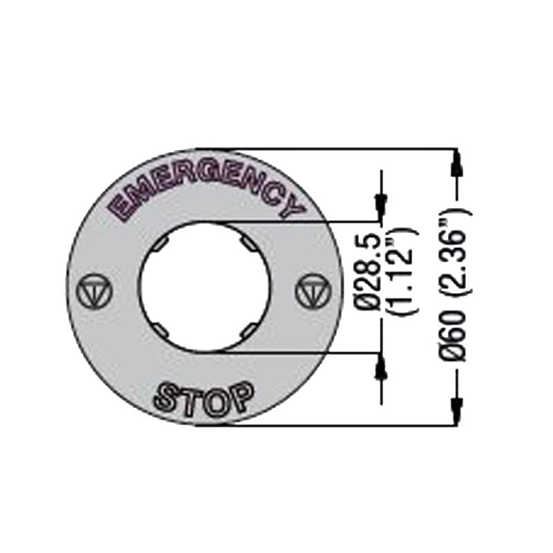 Disco de emergencia Lovato para pulsadores de seta, plástico, diámetro 60 mm, con inscripción EMERGENCY/STOP.