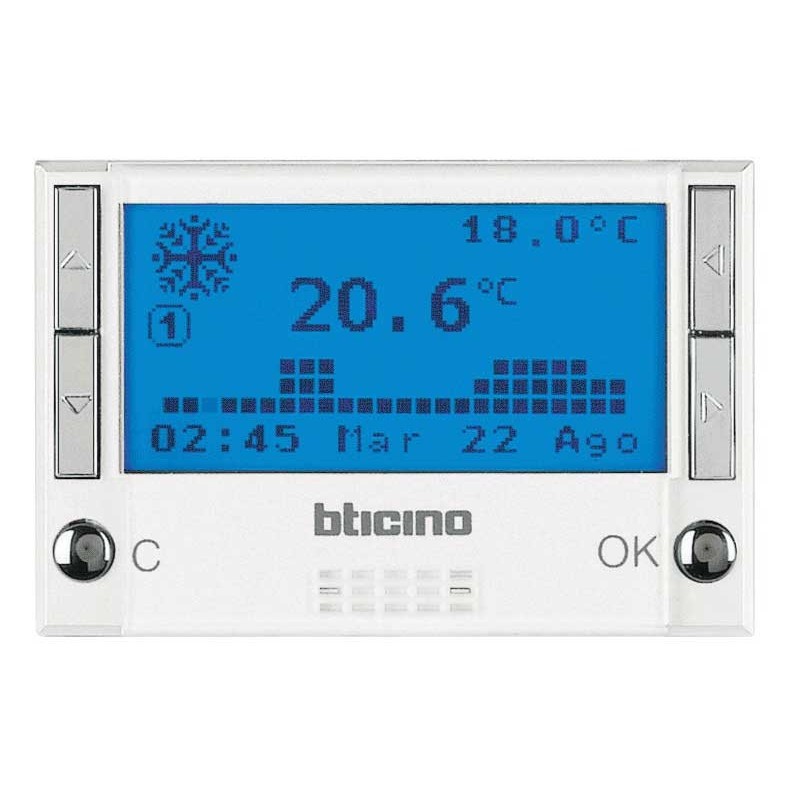 El cronotermostato conectado a la caldera o al aire acondicionado sirve para programar el encendido y el apagado y también la temperatura deseada. Cronotermostato incorporado diario/semanal para la calefacción y el aire acondicionado.
