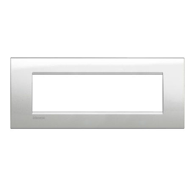 Placa Quadra 7 módulos (frutas, lugares) Bticino LivingLight color plata lunar. Sólo se puede instalar el soporte LN4707. La placa no se instala en otras series Bticino, sino sólo en LivingLight.