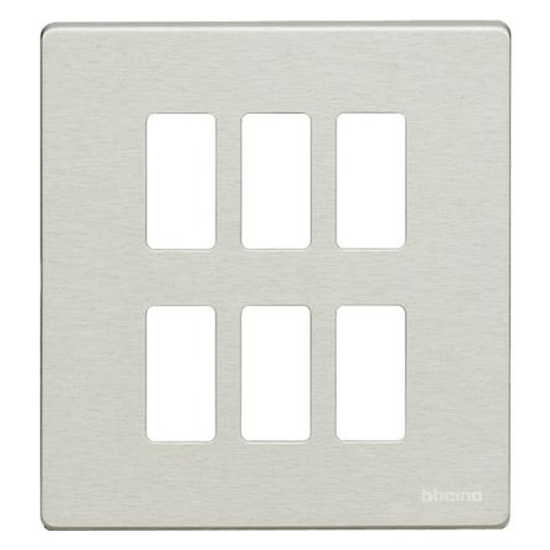 Placa Bticino Magic 3+3 plazas para caja 506E y 506NP, realizada en resina, con enganche gradual para soporte 506S.
