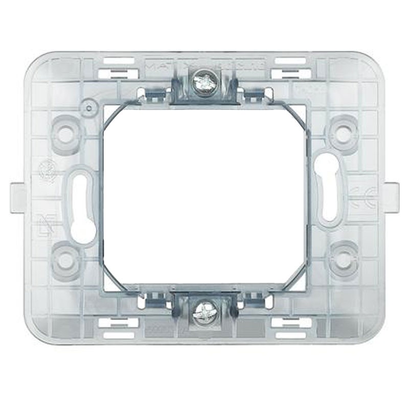 Soporta 2 módulos Bticino Matix. Altura 70 mm, anchura 93 mm. Este soporte permite fijar únicamente las placas Bticino Matix.