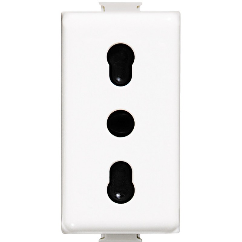 Zócalo eléctrico bipas Bticino Matix, color blanco. La toma de corriente bipas permite insertar tanto los enchufes 10A (enchufes pequeños) como los enchufes 16A (enchufes grandes).