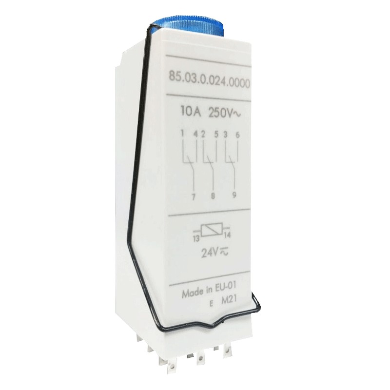 Relé/temporizador enchufable Finder Tipo 85.03 multifuncional, con las siguientes características: