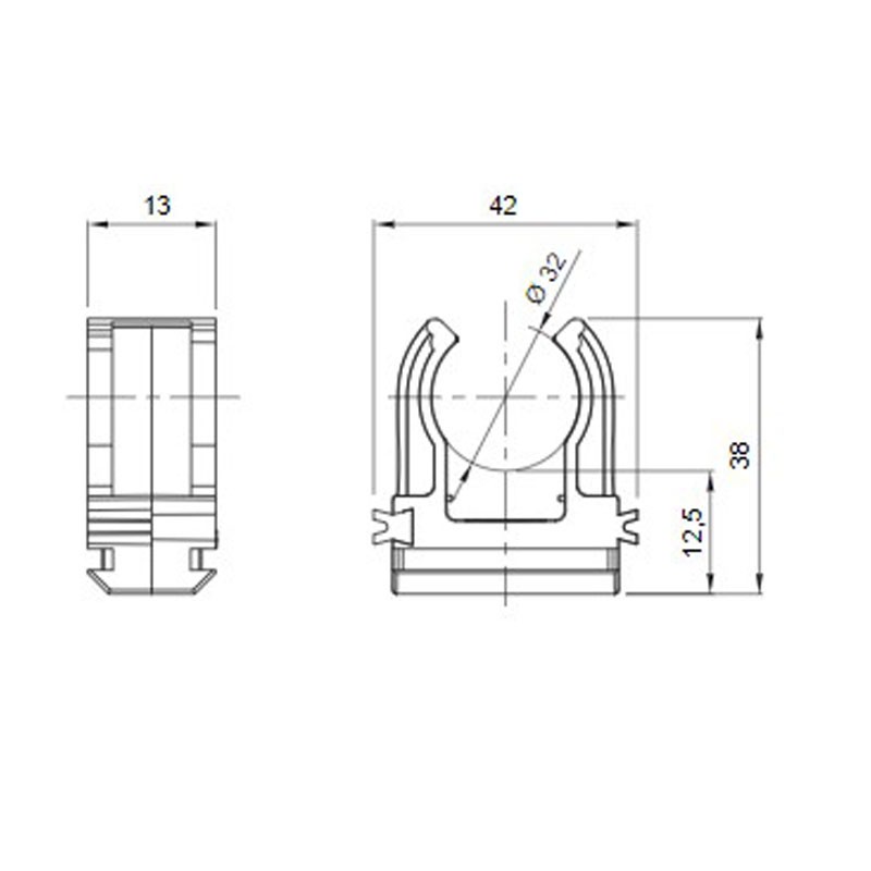 Código Electrocod 21221 EN 61386-1 (según corresponda) Temperatura de funcionamiento -5 +60 °C Tipo de Material libre de Halógenos según norma EN 60754-2 Glow Wire Test de 750 °C Distancia de la pared al eje del tubo (mm) 28 Inserción-En el accesorio Para tubo de Ø exterior (mm) 32 Color Gris RAL 7035 Material de Polímero anti-shock