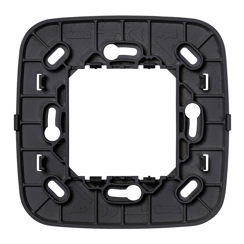Soporte de radio Vimar Arkè para instalación en la pared para control de radio EnOcean, Bluetooth, ZigBee, color, gris. Gracias a las ranuras centrales es posible fijar el soporte a ras de la pared.