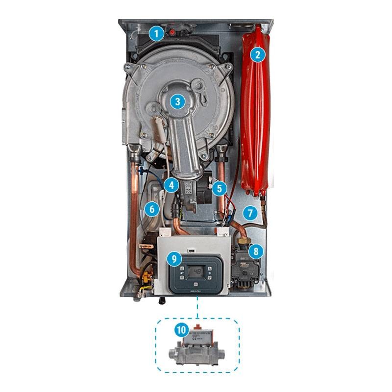 El intercambiador de calor consta de una cámara de combustión, una zona de condensación y un disco metálico aislado y protegido con fibra cerámica de silicona que separa ambas zonas. La utilización de una única banda de acero inoxidable para fabricar la bobina, incluidas las conexiones de entrada y salida, permite obtener las siguientes ventajas