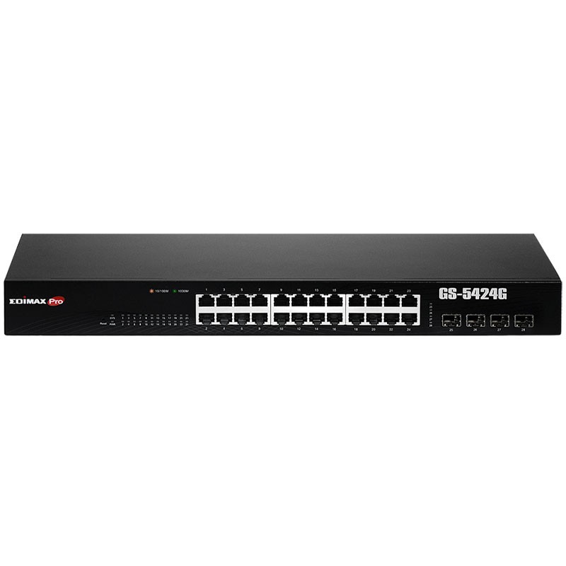 - El switch inteligente Edimax Pro GS-5424G cuenta con una interfaz de usuario basada en la web, 24 puertos Gigabit y 4 ranuras SFP para conexiones ópticas, en las que se utilizan módulos/transceptores SFP multimodo o monomodo para la transmisión de datos Gigabit de alta velocidad y de largo alcance. Con funciones inteligentes en SNMP v3, Dual Firmware, VLAN de voz, DHCP Snooping, QoS, CoS, STP, VLAN 802.1Q, IPv4/IPv6, Port Trunk, IGMP v1/v2/v3 Snooping y Mirror, proporciona una solución de conmutación asequible, escalable y segura para las redes de PYMES. El modo específico de largo alcance de Edimax permite la transmisión de datos hasta 200 metros a una velocidad de 10 Mbps a los dispositivos de red más distantes. El Edimax GS-5424G es la solución ideal para aumentar la distancia/velocidad de las conexiones del servidor de red y de la red troncal.