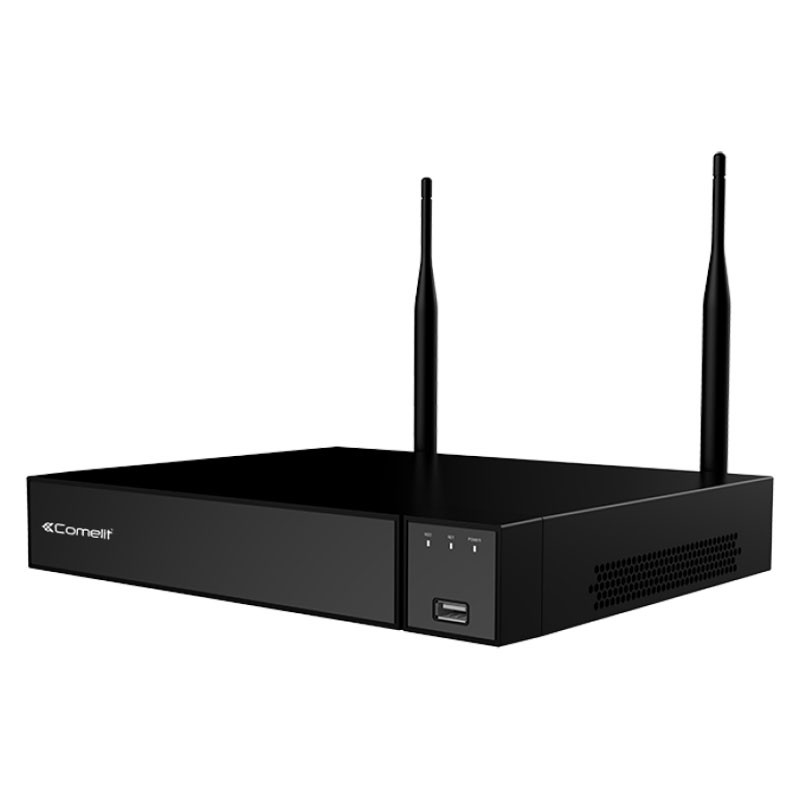 KIT de video Vigilancia Comelit WI-FI está compuesto por: 1 pieza grabadora de vídeo en red (NVR) de Wi-Fi de conexión a internet para el 9 de entradas de IP de 5MP / 3MP / FULL HD (1080p) / HD (960p/720p), compatibile ONVIF 2.4. - 4 piezas de la Cámara IP Wi-Fi de viñeta a color de Día y de Noche, lente fijo de 3.6 mm, resolución FULL HD (1080p)@30 ips, un contenedor a prueba de agua IP66, 14 iluminadores de infrarrojos rango de 30 metros (Smart IR). Fuentes de alimentación incluido.