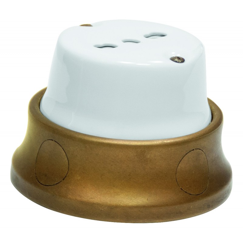 Toma de corriente Gambarelli de dos vías 16A 250V, de porcelana y latón antiguo. Se utiliza para la realización de instalaciones de tubos de porcelana y latón. Este tipo de producto se elabora de forma artesanal y se trata de manera que permita el envejecimiento natural (oxidación) del producto con el paso del tiempo, para no comprometer su autenticidad. Esta alteración puede ser más o menos evidente y diferente según la zona de instalación.