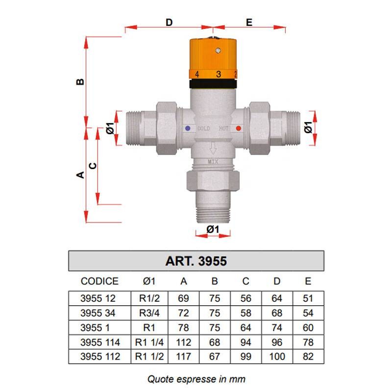 - Mezclador termostático, para instalaciones solares, de latón cromado, con conexiones macho 1/2"-3/4-1"-1"1/4-1"1/2 con asiento plano completo de racores y juntas de EPDM, mando de regulación, de nylon, provisto de selector numerado del 1 al 5 correspondiente a un campo de regulación de 30-65°C y dispositivo de bloqueo de la temperatura, elemento termosensible de cera. Temperatura máx. de entrada 110°C. Presión máx. de servicio 10 bar.
