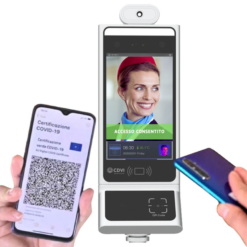 - El sistema diseñado para el reconocimiento facial, la detección de la temperatura corporal y el pase verde, garantiza la gestión automática de las entradas para la prevención de epidemias. Se puede instalar en cualquier entorno señalando en tiempo real la alta temperatura, la cara no reconocida o el pase verde no válido. Sencillo y rápido de instalar en cualquier entorno. Viene con un software de gestión para controlar varios dispositivos. La detección de la temperatura y del paso verde es rápida y fiable.