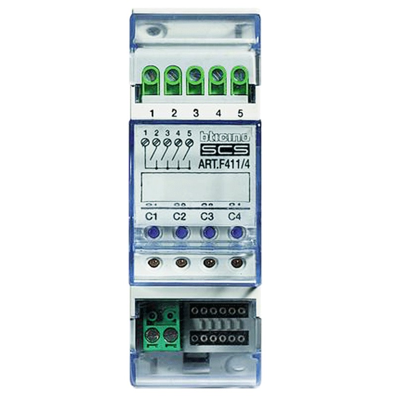 Actuador DIN con 4 relés Bticino independientes, con las siguientes características: