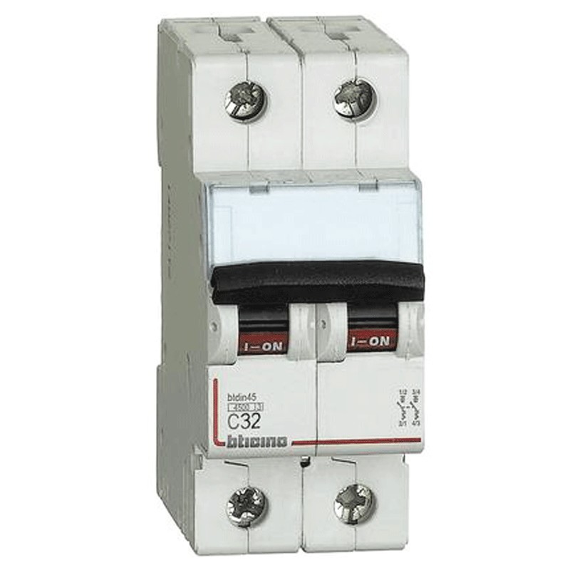 Interruptor de circuito: 2 módulos DIN (fijación universal para cualquier pbx en el mercado) (Marca: Bticino) (Postes: 2P) (Amperios: 32) (capacidad de ruptura: 4.5 kA) (Curva: C)