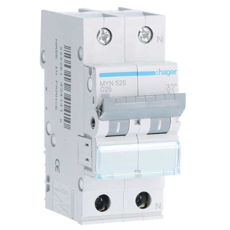 Interruptor de circuito de Hager 1P+N 25A 4.5 KA C 2 módulos MYN525