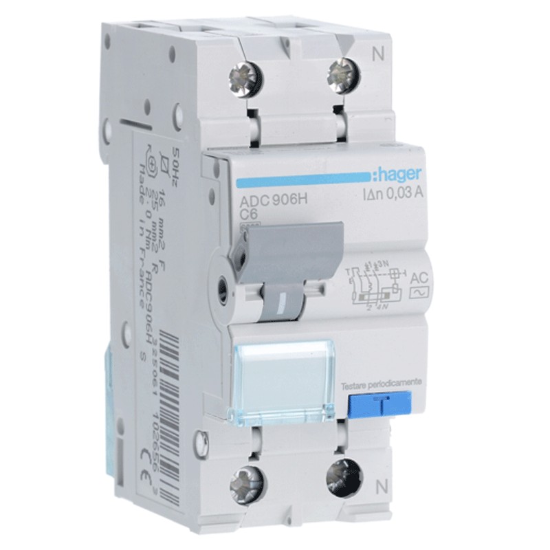 Interruptor magnetotérmico diferencial Hager, 2 módulos, conexión DIN (universal para cualquier cuadro de distribución del mercado), 1P+N, 6 amperios, poder de corte 6kA, tensión nominal 240 Vac, corriente diferencial nominal 30mA, tipo AC, curva de disparo C.