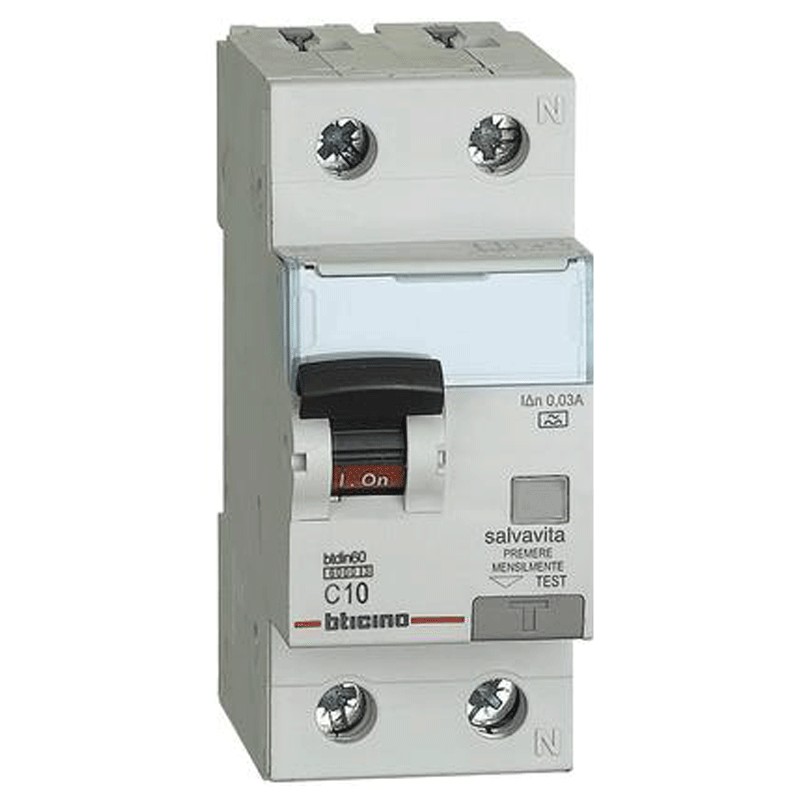 Interruptor automático termomagnético diferencial Bticino, 2 módulos, conexión DIN (universal para cualquier cuadro de distribución del mercado), polos 1P+N, 10 amperios, poder de corte 6kA, tensión 230 Vac, corriente diferencial Idn 0,03A, tipo A, curva de disparo C.