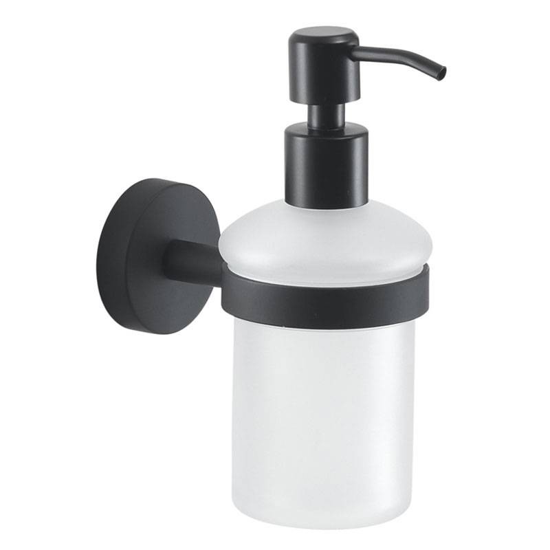 Dispensador de jabón líquido de pared Gedy fabricado en acero inoxidable y Cromall con recipiente de cristal esmerilado, color negro mate, dimensiones 6,8x10,7x15,9cm.