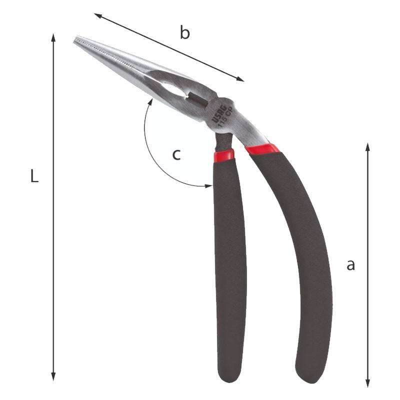 Alicates doblados Usag 115-CP con mordazas semirredondas extra largas, longitud 170 mm, con cuerpo doblado respecto al eje del mango para un agarre frontal más cómodo.